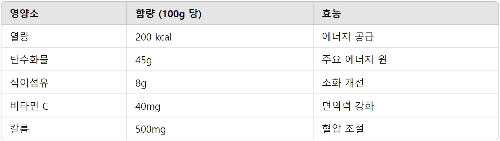 100g 기준으로 약 200kcal의 열량을 제공하며, 이는 에너지 보충에 도움이 됩니다.