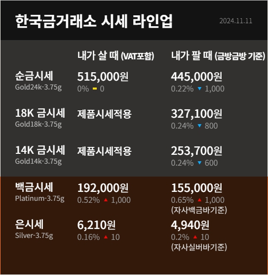 | 오늘의 금시세 (11월 첫째 주) 반돈 한돈 18k 14k 1돈 살때 팔때 (0) | 2024.11.05 |